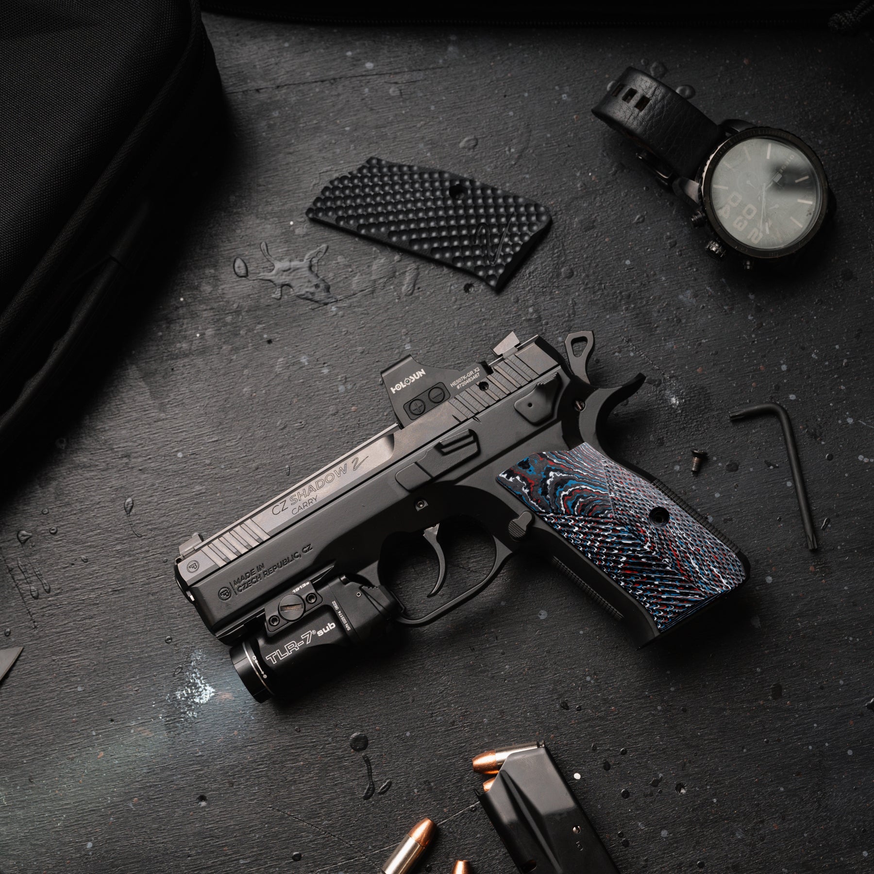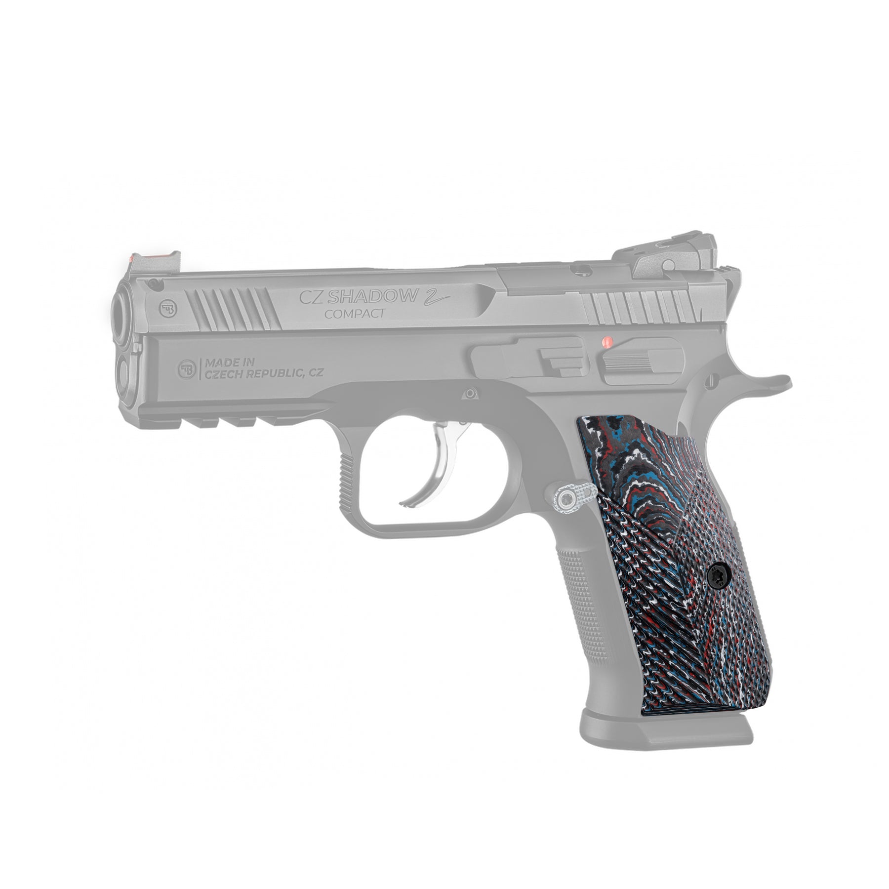 Introducing the exceptional, one-of-a-kind Tricolor grip for the CZ Shadow 2 Compact — an exclusive piece created for the occasion of celebrating national pride. This one-of-a-kind piece combines premium carbon material with precision craftsmanship and a design inspired by the Czech tricolor and flag, giving your pistol an unmistakable look.
